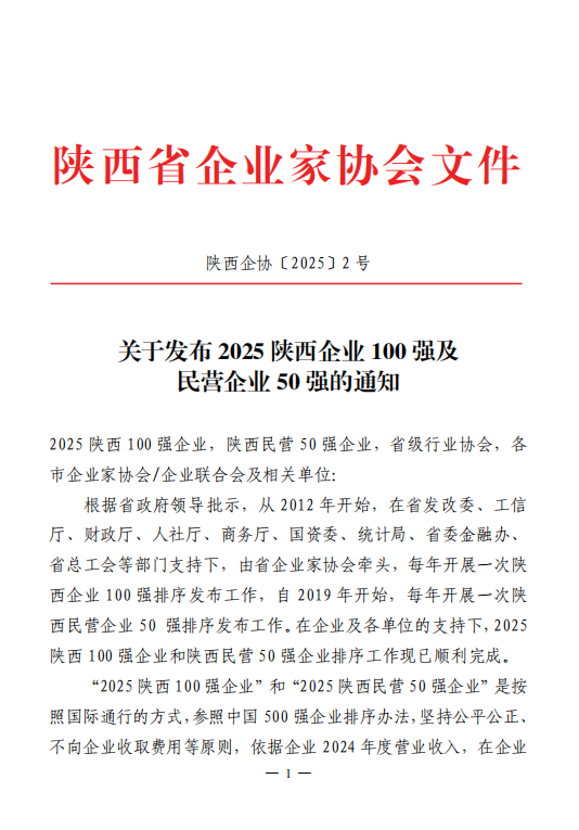 2025年,在陜西省發(fā)改委、工信廳、財(cái)政廳、人社廳、商務(wù)廳、國資委、統(tǒng)計(jì)局、省委金融辦、省總工會(huì)等部門的大力支持下,陜西省企業(yè)家協(xié)會(huì)繼續(xù)組織開展了2025陜西100強(qiáng)企業(yè)和陜西民營50強(qiáng)企業(yè)排序工作并編印了《2025陜西100強(qiáng)企業(yè)分析報(bào)告》。