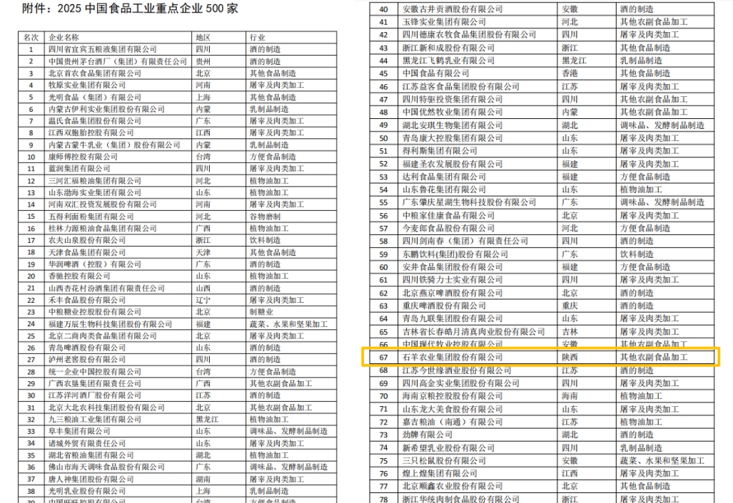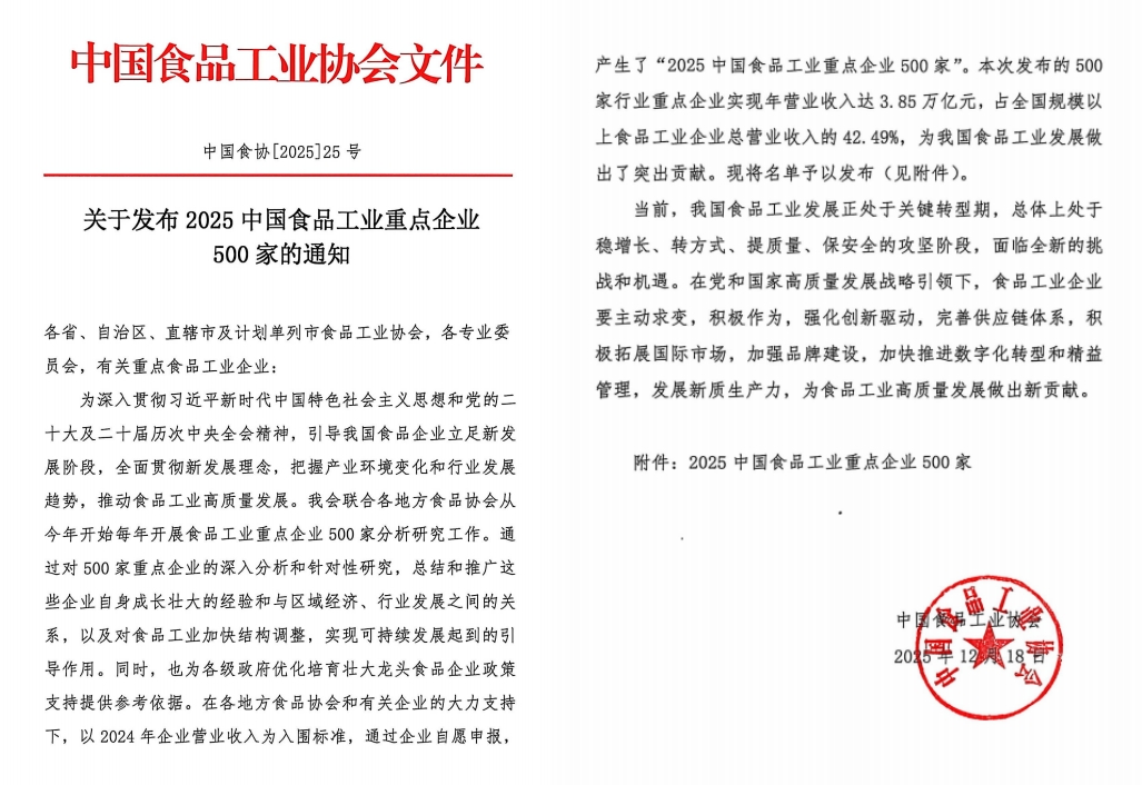 12月25日,“2025全國食品工業(yè)科技進(jìn)步工作會議暨2025中國食品產(chǎn)業(yè)發(fā)展研究報(bào)告發(fā)布會”在京召開,中國食品工業(yè)協(xié)會牽頭組織編寫的《2025中國食品產(chǎn)業(yè)發(fā)展報(bào)告》發(fā)布,并同期首度發(fā)布了“2025中國食品工業(yè)重點(diǎn)企業(yè)500家名單”。石羊集團(tuán)憑借在農(nóng)業(yè)食品領(lǐng)域的深厚積淀與卓越實(shí)力,成功躋身榜單、位列第67名,彰顯了行業(yè)對企業(yè)綜合實(shí)力的高度認(rèn)可!中國食品工業(yè)協(xié)會常務(wù)副會長沈箎、中國工程院院士任發(fā)政致辭,副會長兼秘書長馬勇作了《食品工業(yè)生產(chǎn)運(yùn)行與科技創(chuàng)新發(fā)展報(bào)告》,中國食品工業(yè)協(xié)會黨委書記、副會長王琪主持會議。